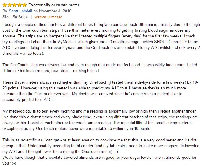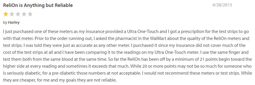 At one point, I decided I wanted to save money on test strips so I switched to a ReliOn Prime, Walmart's brand blood sugar monitor. They are known to have really inexpensive test strips which is great if your insurance company doesn't cover the cost of test strips. Unfortunately, I found the monitor to be grossly inaccurate. My starving blood sugar readings first thing in the morning were 90, 108, and 132. So basically I wouldn't be able to tell if my blood sugar was fine (90), prediabetic (108) or diabetic (132). Crazy! After reading the review, it turns out I wasn't the only one with this problem.